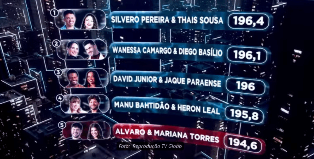 A noite foi marcada por apresentações equilibradas e notas altas, tornando a diferença entre as posições mínima. Silvero Pereira e Thaís Sousa fecharam o dia com 196,4 pontos, garantindo o topo da classificação. Wanessa Camargo e Diego Basílio chegaram logo atrás, com 196,1. Manu Bahtidão e Heron Leal somaram 196,0, enquanto David Junior e Jaque Paraense ficaram com 195,8.