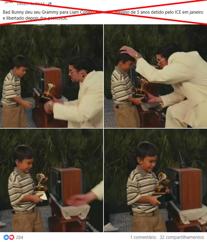 Uma informação que ganhou grande repercussão nas redes sociais após o show do intervalo do Super Bowl de 2026 foi oficialmente desmentida. Publicações afirmavam que o cantor Bad Bunny teria entregue seu prêmio Grammy a Liam Conejo Ramos, menino de cinco anos que havia sido detido pelo serviço de imigração dos Estados Unidos (ICE). No entanto, a história não procede.