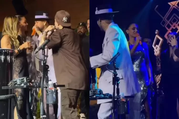 O casal participou de um evento de poker realizado na noite da última quinta-feira (18), em São Paulo. Durante o show do grupo Jeito Moleque, Neymar subiu ao palco, pegou o microfone e o entregou à esposa, que inicialmente demonstrou timidez diante do público.