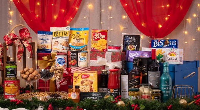 A lista analisada inclui alimentos típicos das celebrações: peru, lombo suíno, atum sólido, espaguete, caixa de bombons, panetone, vinho tinto, champagne, sucos néctar, molho de tomate, azeitonas, palmito, queijo ralado e azeite de oliva.