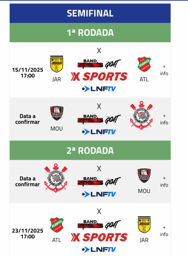 Com a vitória, o Corinthians avança às semifinais da LNF, onde enfrentará o Campo Mourão, do Paraná. O clube paulista busca seu terceiro título nacional, após as conquistas de 2016 e 2022. Do outro lado da chave, Atlântico Erechim e Jaraguá disputam a outra vaga na grande final.