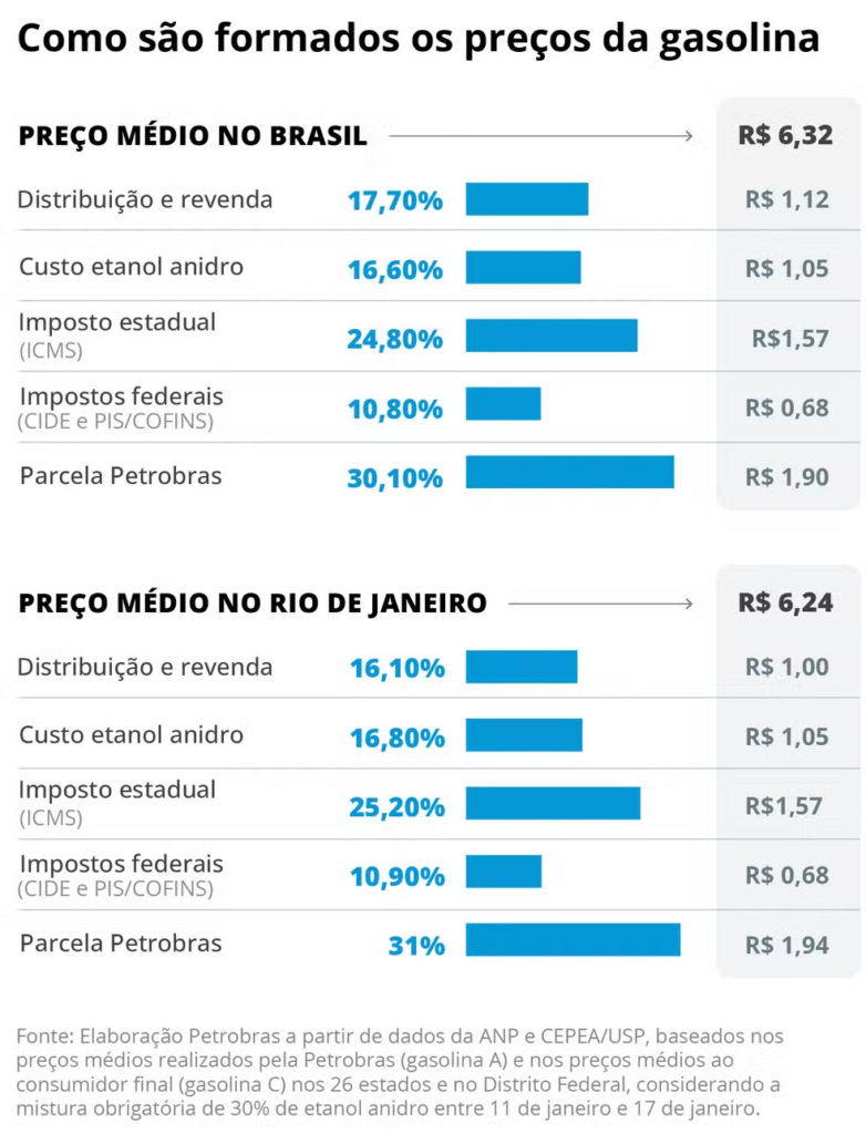 Desde 2022, o ICMS sobre combustíveis passou a ser unificado nacionalmente e sofre reajuste anual definido pelos estados. Em 2026, a alíquota subiu para R$ 1,57 por litro, mesmo diante da queda nos preços praticados pelas refinarias. O Comsefaz justificou o aumento afirmando que o cálculo do imposto considera a variação do preço final ao consumidor, que não teria refletido integralmente as reduções promovidas pela Petrobras.