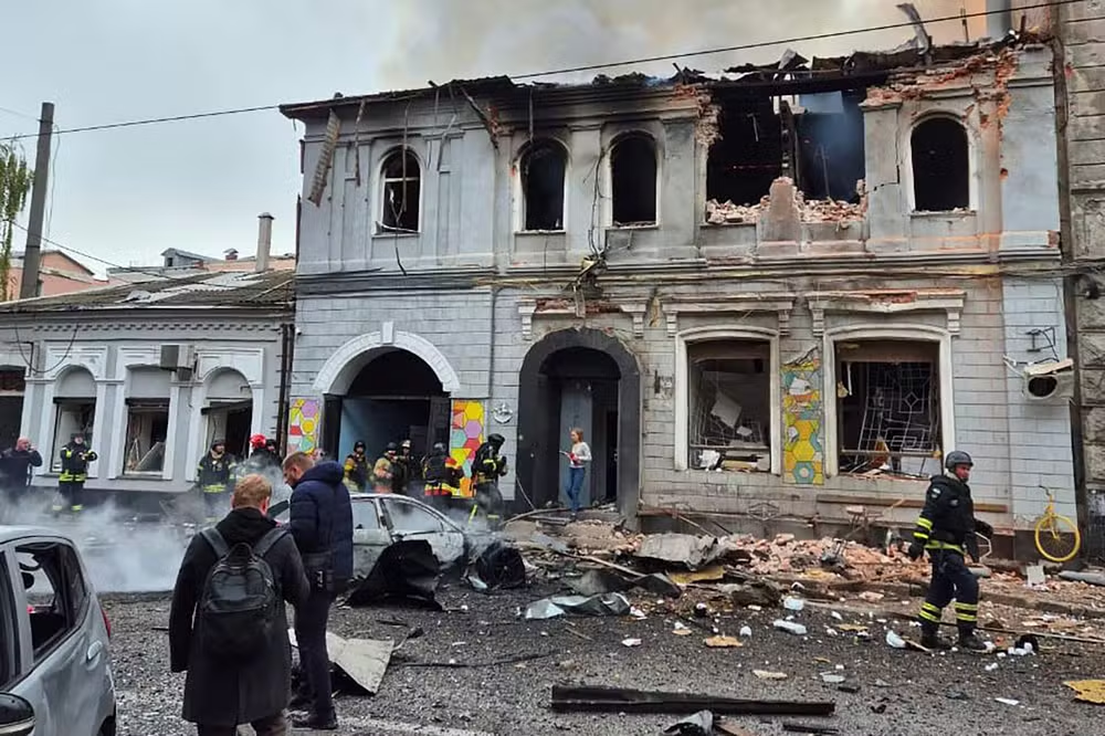 Policiais ucranianos isolam área de jardim de infância em Kharkiv, atingido por drone russo — Foto: Serviços de Emergência da Ucrânia via AFP