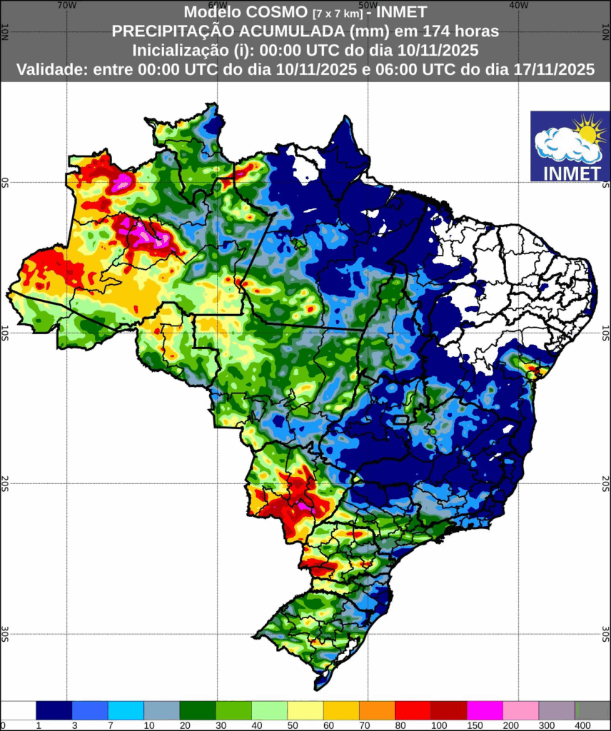 O Instituto Nacional de Meteorologia (INMET) emitiu um alerta para o avanço de uma frente fria combinada com um corredor de umidade e áreas de instabilidade tropical, que deve provocar chuvas intensas em boa parte do Brasil entre os dias 10 e 14 de novembro.
