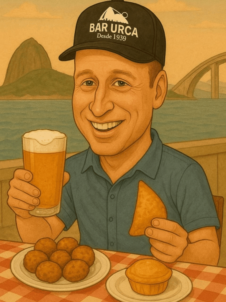 Acompanhado por cerca de 20 pessoas, William chegou de forma discreta e aproveitou o cardápio típico de boteco, experimentando petiscos como bolinho de bacalhau, linguiça e empadinhas, além de brindar com chope e caipirinhas — tudo com o descontraído espírito carioca.