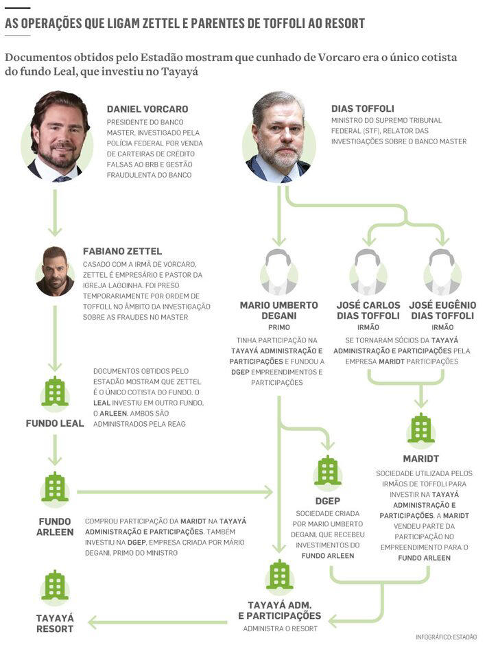 Documentos indicam que fundos controlados por empresários ligados ao Banco Master aportaram cerca de R$ 20 milhões no Tayayá Resort, incluindo a compra de participações que antes pertenciam à família do ministro. Um dos representantes envolvidos na transação é investigado em apurações que miram suspeitas de lavagem de dinheiro e vínculos com organizações criminosas.