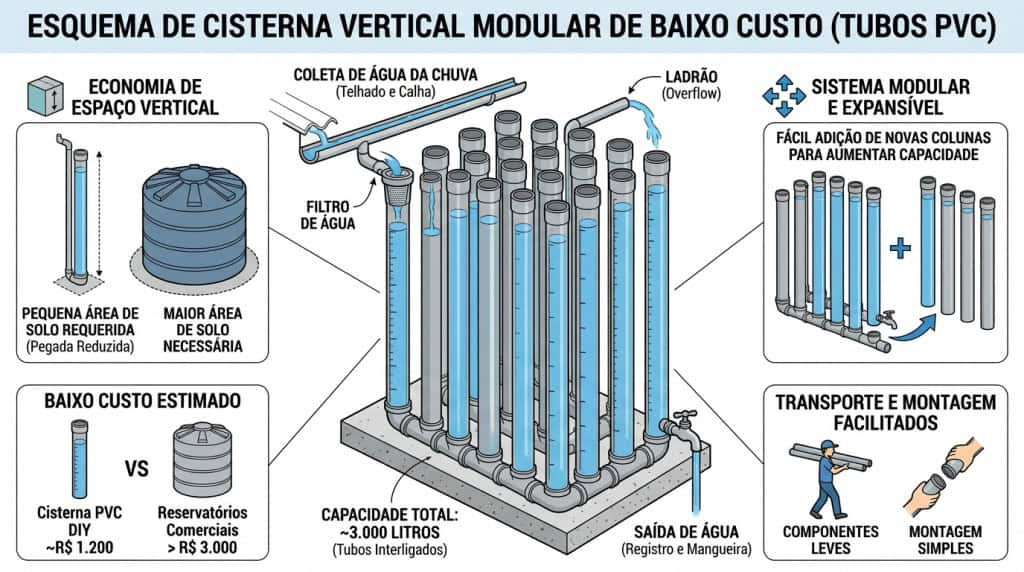 Outra vantagem apontada é o custo reduzido. Enquanto reservatórios convencionais de grande capacidade podem custar vários milhares de reais, o sistema modular de tubos pode ser montado com investimento estimado abaixo de R$ 1.200, dependendo do preço dos materiais e da quantidade de colunas instaladas.