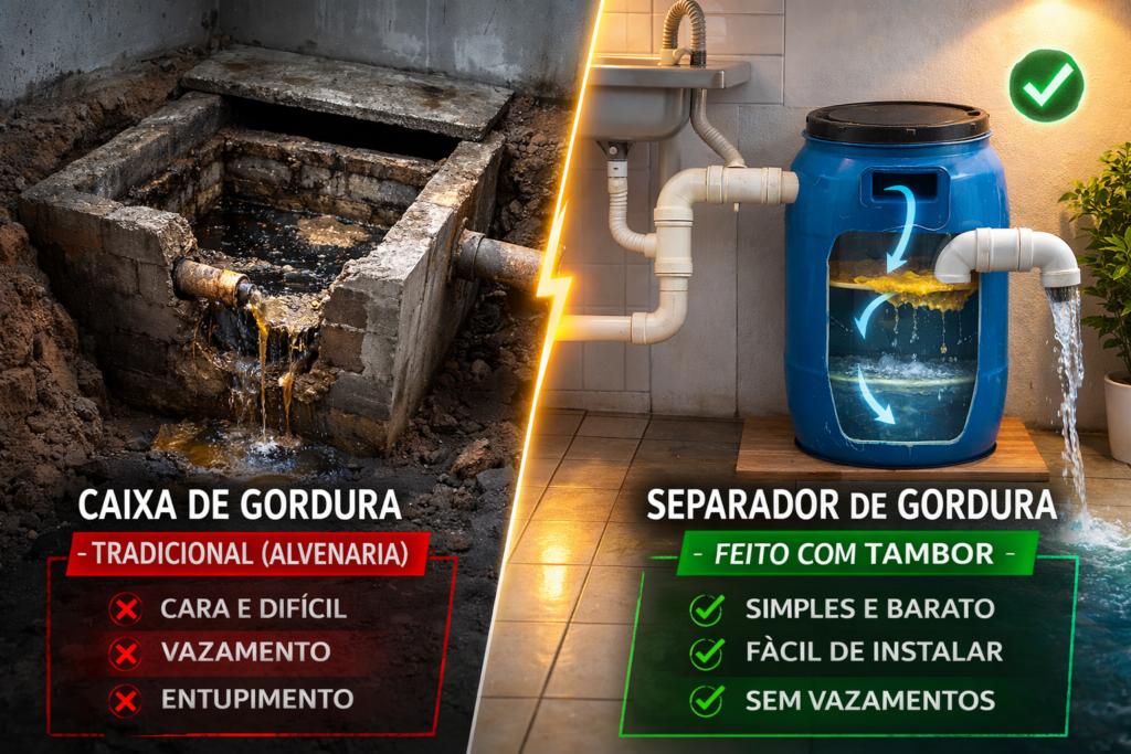 Uma solução simples e de baixo custo está chamando atenção entre proprietários de casas e pequenos sítios: a construção de um separador de gordura doméstico utilizando tambor plástico e tubos de PVC. O sistema pode custar entre R$ 300 e R$ 500, bem abaixo dos modelos comerciais, que chegam a ultrapassar R$ 1.800.