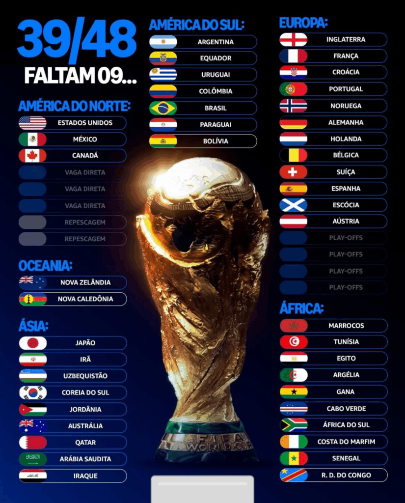 Com o encerramento das Eliminatórias ao redor do mundo, 22 seleções garantiram a chance de disputar as últimas vagas do Mundial. Seis lugares ainda estão disponíveis — dois no playoff global e quatro na repescagem destinada exclusivamente às seleções europeias.
