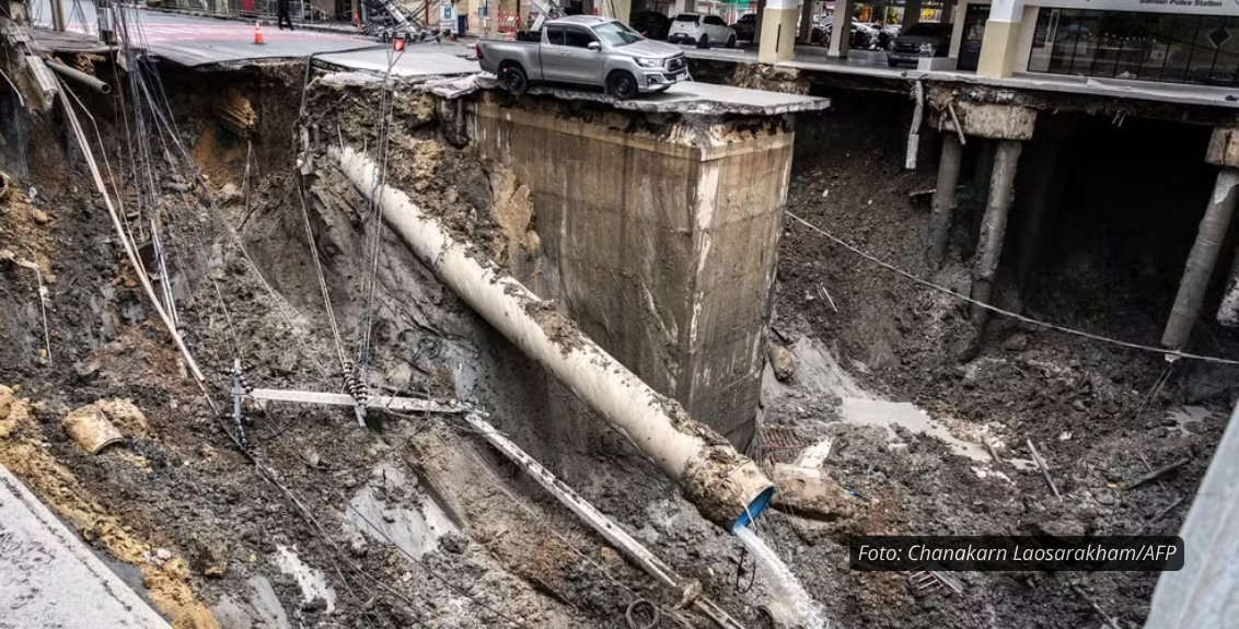 Uma enorme cratera se abriu nesta quarta-feira (24) no centro de Bangkok, capital da Tailândia, causando pânico, interrompendo atendimentos hospitalares e afetando o fornecimento de água e energia na região. Autoridades apontam obras do metrô como causa provável do deslizamento de terra que gerou o colapso no asfalto.